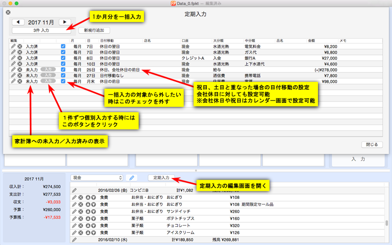 定期入力画面では、登録および家計簿への一括入力が行えます。