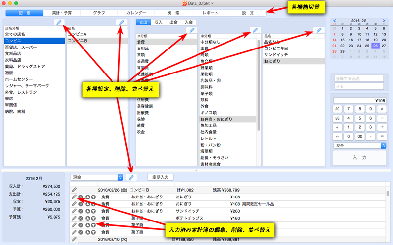 ・家計簿欄の左側にあるボタンで、編集、削除、並べ替えができます。