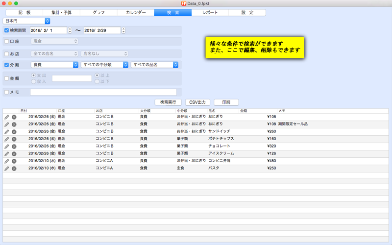 ● 何も条件を設定せずに『検索実行』をクリックすると、これまでに入力された全ての家計簿データが表示されます。